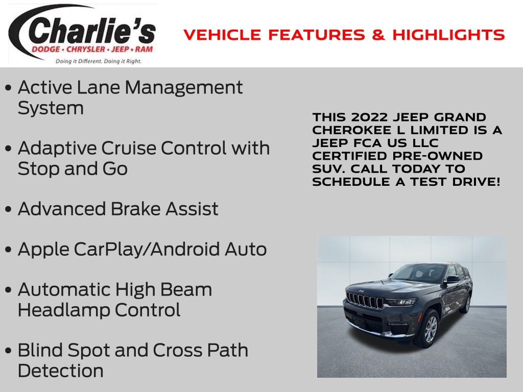 Active Lane Management System, Adaptive Cruise Control with Stop and Go, Advanced Brake Assist, Apple CarPlay/Android Auto, Automatic High Beam Headlamp Control, Blind Spot and Cross Path Detection, Driver Seat Memory, Fullâ"Speed Forwardâ"Collision Warning Plus, Heated Front Seats, Heated Steering Wheel, ParkView Rear Back Up Camera, Parksense Rear Park Assist with Stop, Pedestrian Emergency Braking, Power Liftgate, Remote Start System, Universal Garage Door Opener, Quick Order Package 22E.