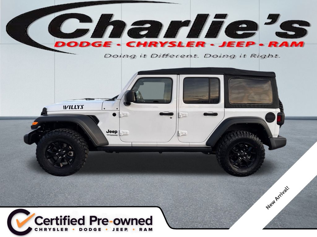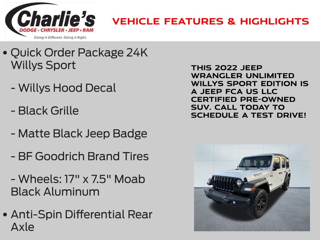 Apple CarPlay/Android Auto, ParkView Rear Back Up Camera, 4-Wheel Drive Swing Gate Decal, 97 MPH Vehicle Max Speed Calibration, Anti-Spin Differential Rear Axle, BF Goodrich Brand Tires, Black Grille, Black Trail Rated Badge, Deep Tint Sunscreen Windows, Matte Black Jeep Badge, Mold In Color Bumper w/Gloss Black, MOPAR All-Weather Floor Mats, Quick Order Package 24K Willys Sport, Wheels: 17" x 7.5" Moab Black Aluminum, Willys, Willys Hood Decal.