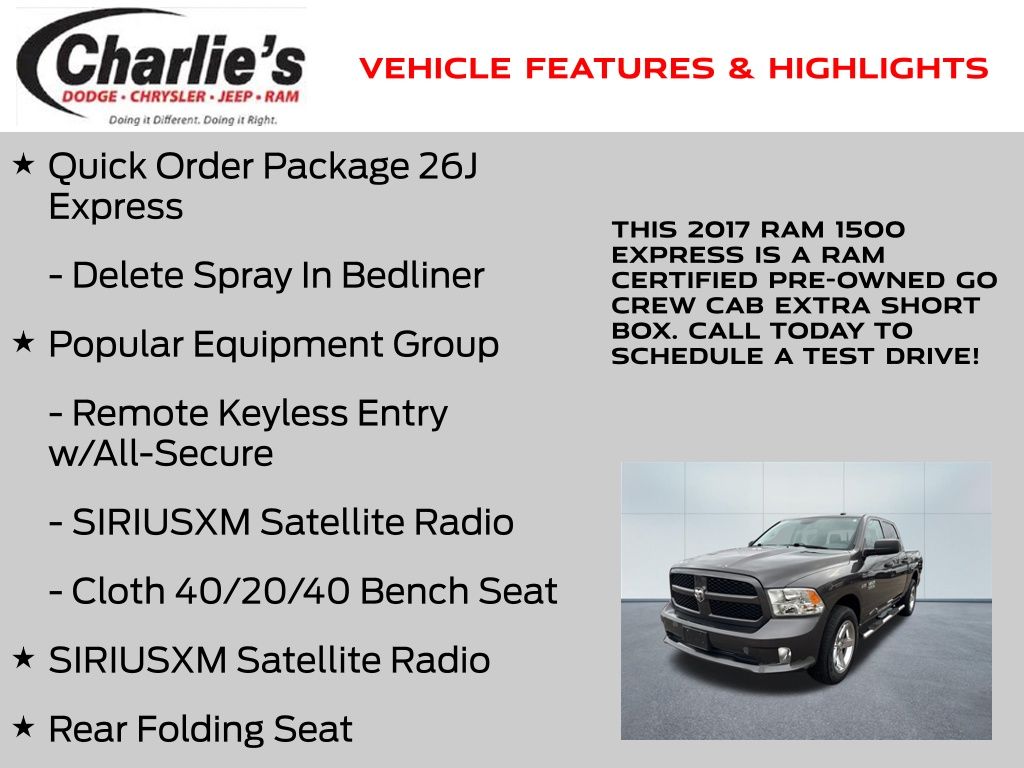 ParkView Rear Back Up Camera, 1-Yr SiriusXM Radio Service, 17" x 7" Aluminum Wheels, 40/20/40 Split Bench Seat, Body Color Front Fascia, Body Color Grille, Body Color Rear Bumper w/Step Pads, Carpet Floor Covering, Center Hub, Cloth 40/20/40 Bench Seat, Delete Class IV Receiver Hitch, Delete Spray In Bedliner, Dual Rear Exhaust w/Bright Tips, Fog Lamps, For More Info, Call 800-643-2112, Front & Rear Floor Mats, Front Armrest w/3 Cupholders, No Satellite Coverage w/AK/HI/PR/VI, Popular Equipment Group, Quick Order Package 26J Express, Ram 1500 Express, Rear Folding Seat, Remote Keyless Entry w/All-Secure, SIRIUSXM Satellite Radio, Storage Tray, Wheels: 20" x 9" Aluminum Chrome Clad.