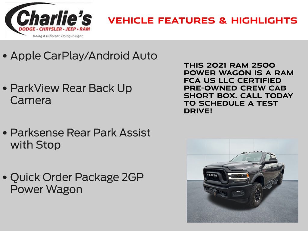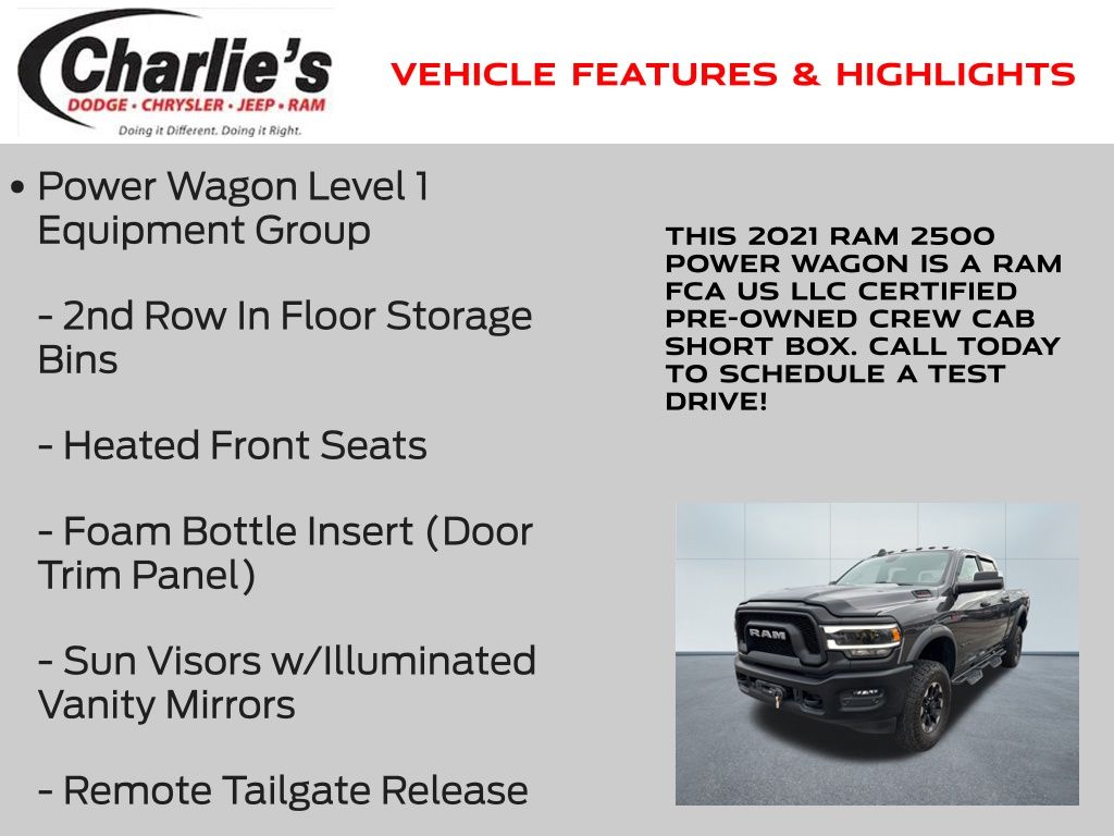 Apple CarPlay/Android Auto, ParkView Rear Back Up Camera, Parksense Rear Park Assist with Stop, 2nd Row In Floor Storage Bins, 4.10 Axle Ratio, Bed Utility Group, Foam Bottle Insert (Door Trim Panel), Heated Front Seats, Heated Steering Wheel, LED Bed Lighting, MOPAR Deployable Bed Step, MOPAR Spray In Bedliner, Power Adjustable Pedals, Power Wagon Level 1 Equipment Group, Quick Order Package 2GP Power Wagon, Remote Start System, Remote Tailgate Release, Sun Visors w/Illuminated Vanity Mirrors, Universal Garage Door Opener.